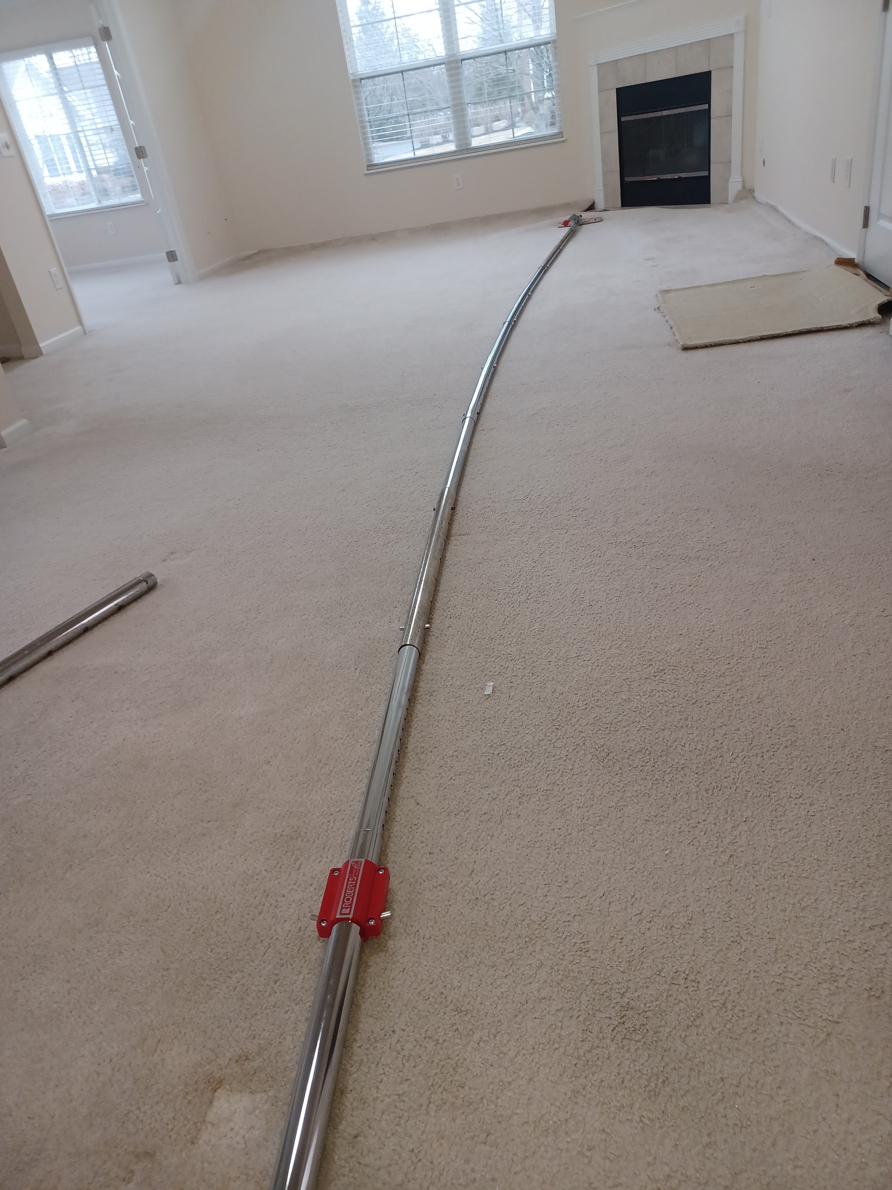 I was careful to not pull that much. There are actually 3 rooms adjoining the one in the picture. All not doorways, but wide openings. Also on the opposite side, not shown it connects to a hall that is at 45 degree angle. I told the agent I would do my best, but needed to avoid opening up a bunch of seams. I did need to do patch( sorry, !!! bonded insert) to cover gap by the fireplace.