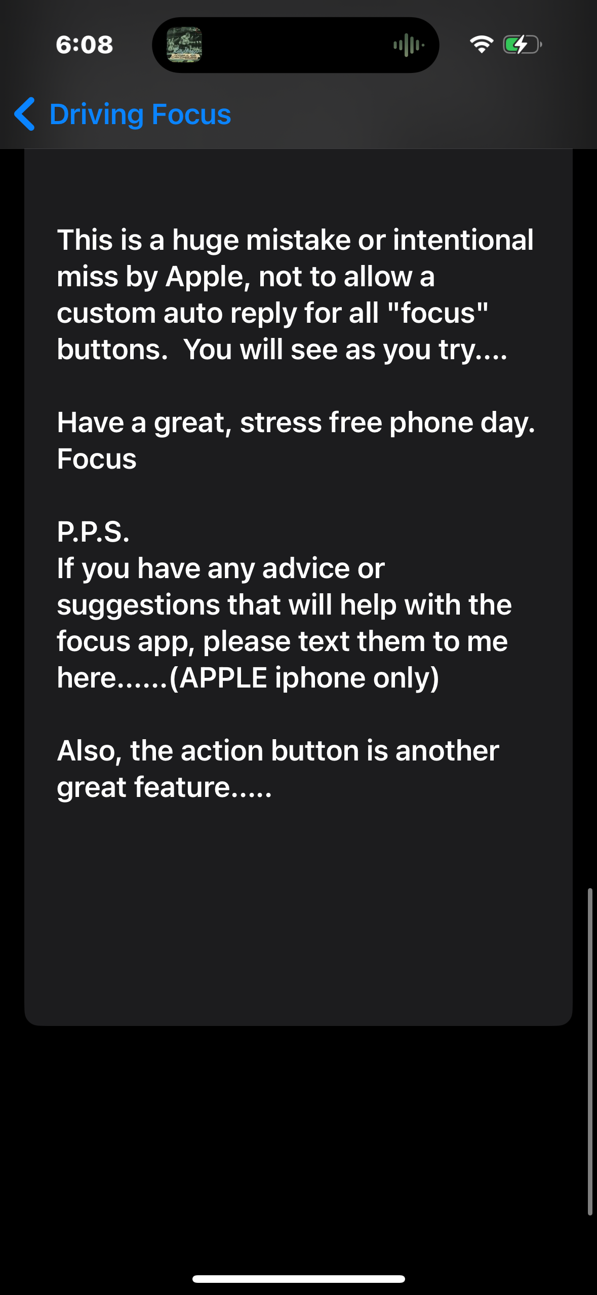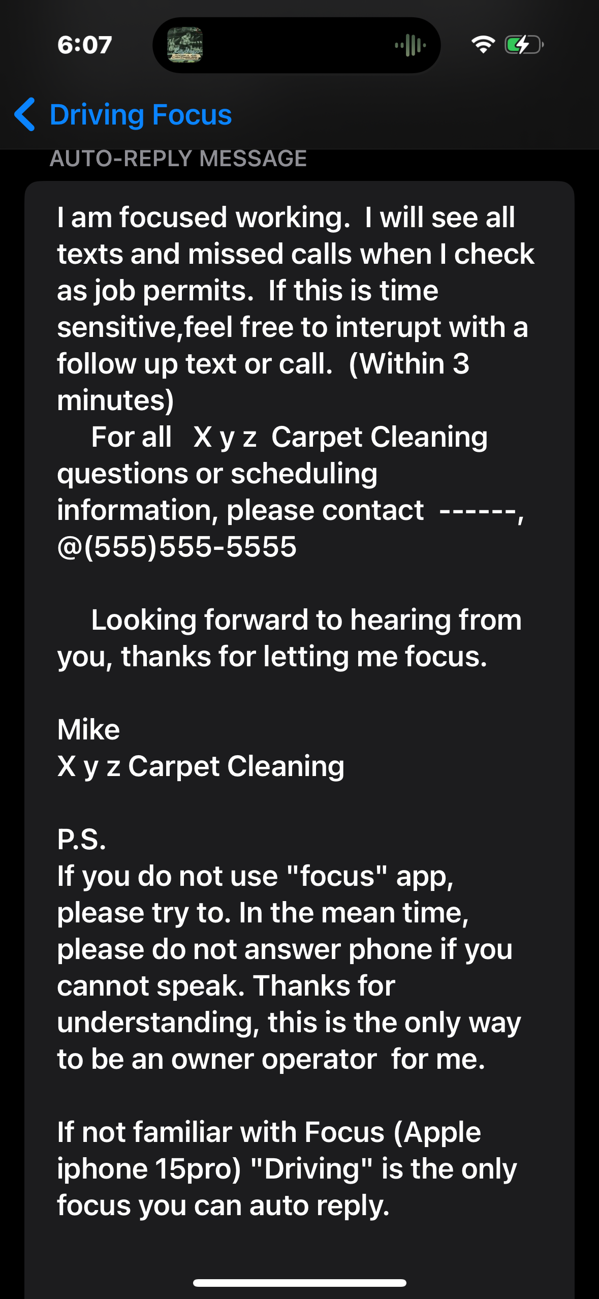 Androids can do auto reply to phone and text. Simple as it should be. I will stop my crying now. Im getting an Android tomorrow, and will only use my iphone 15 pro for a camera.