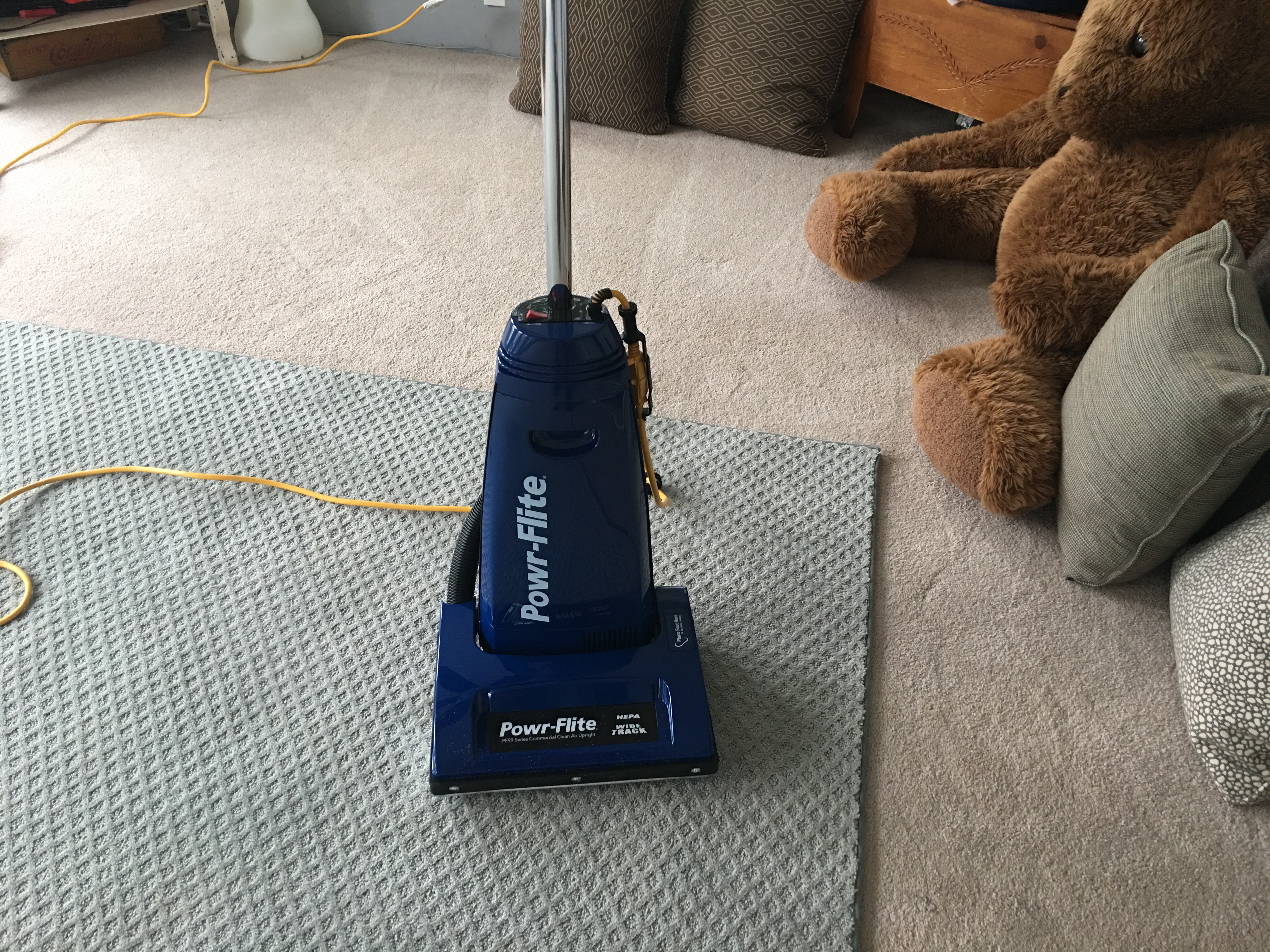I've got a smaller version of that Hoover Matt's been using. I didn't even know it was called a Conquest but mine uses replaceable bags and has a hard cover. It's black and orange, super ugly like my Hoover canister vac.
