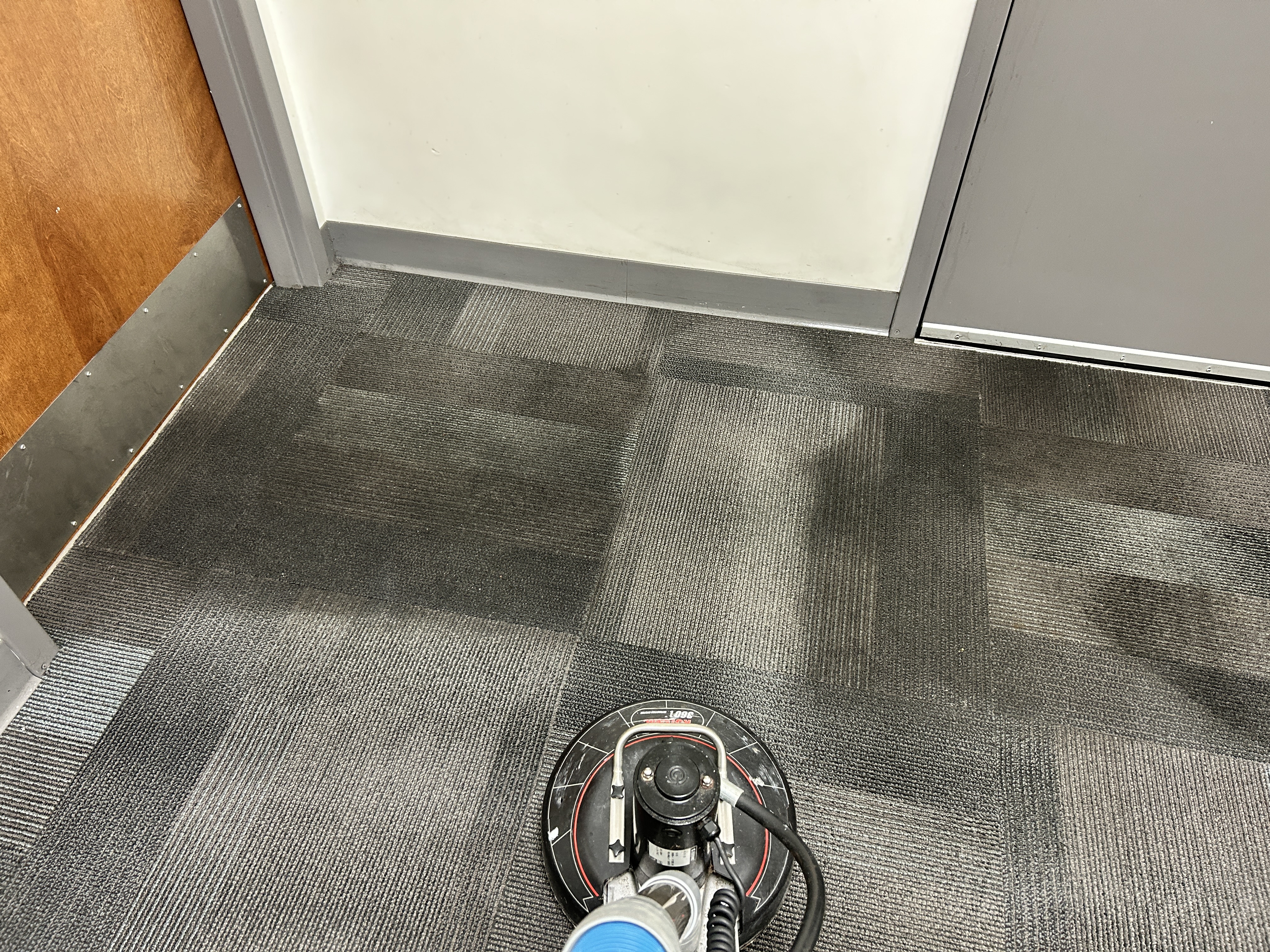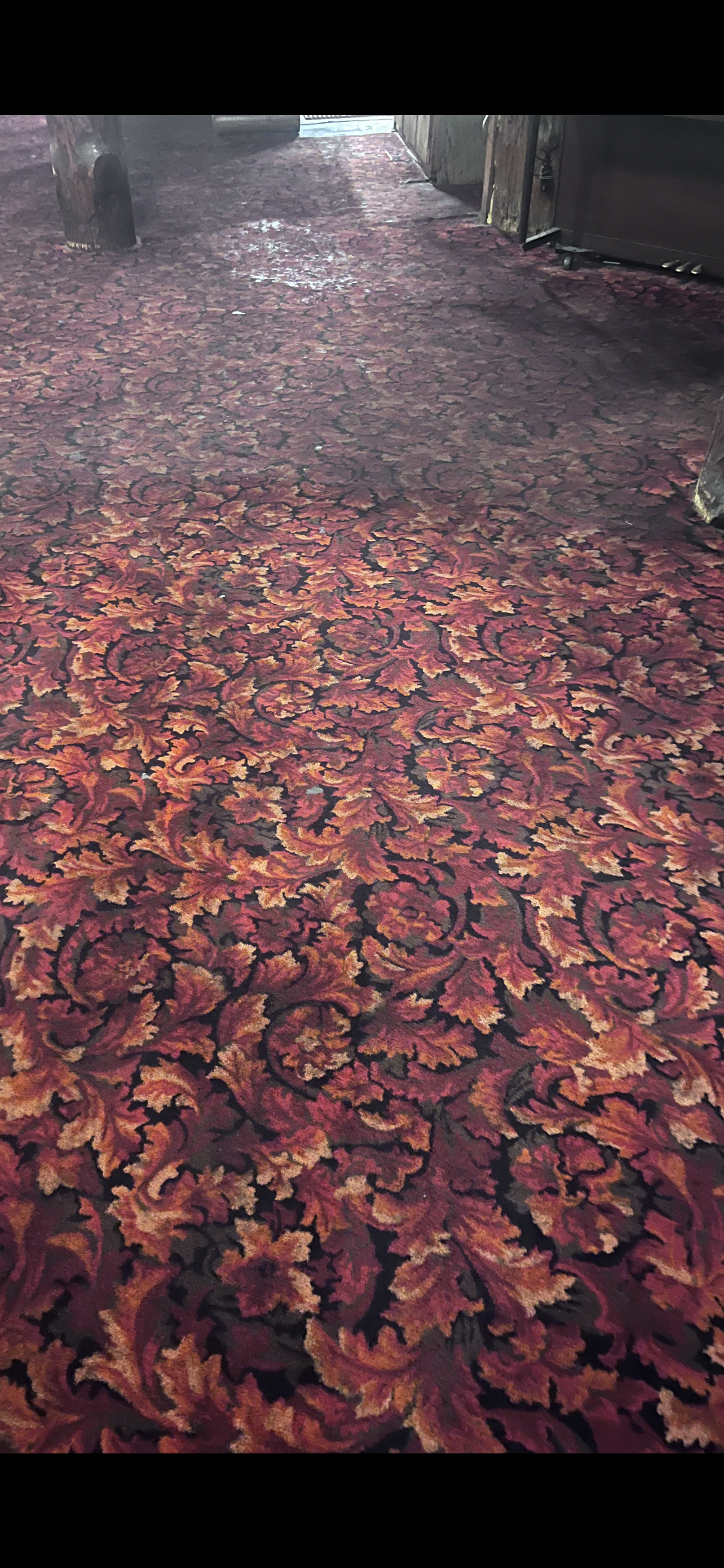 It looks like a casino I did tuesday at 6am same type of carpet all the black was from spilled drinks when they get excited when they win. I could only pad clean it they open at 9am . They were very happy I would love to truckmount it but no drying time .Sorry I dont know how to show pictures.